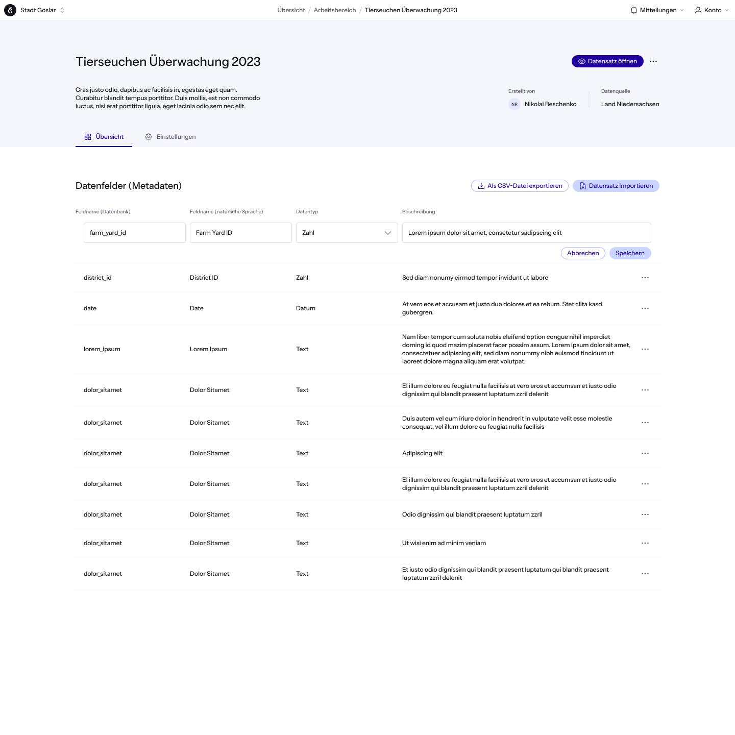 Nach der Benennung des Datensatzes wird eine neue Unterseite erstellt, was auch im Breadcrumb sichtbar ist. Oben werden der vergebene Name und die Beschreibung des Datensatzes angezeigt. Zudem stehen zwei Tabs zur Verfügung: Übersicht und Einstellungen. Auf der Übersicht kann der Nutzer die Datensatzdatei entweder per Drag & Drop oder über den Dateibrowser importieren.